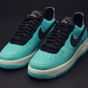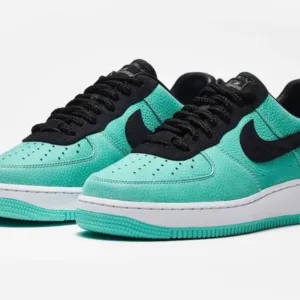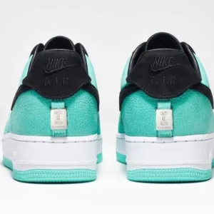 - The reverse colorway of the Tiffany & Co. Nik Air Force 1 features “Tiffany Blue” premium tumbled leather uppers paired with black suede Swooshes.